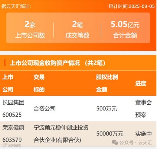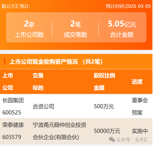 2025年3月5日,资产交易成交金额5.05亿元,上市公司2家,成交2笔,上市公司现金收购资产2笔。