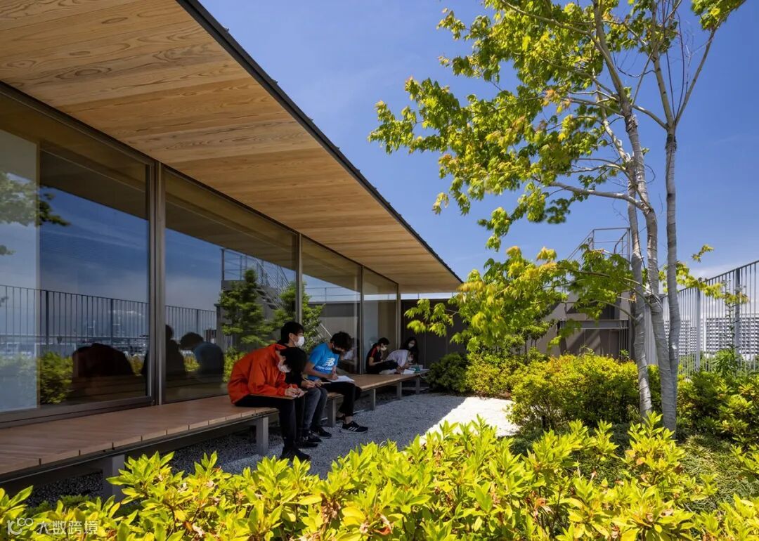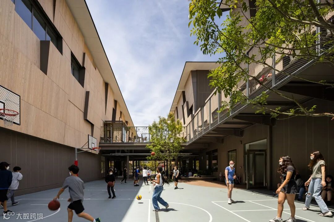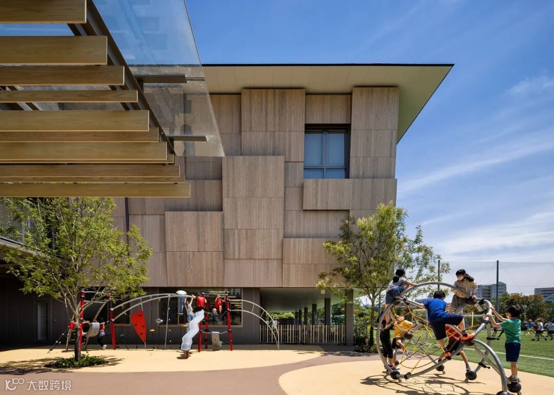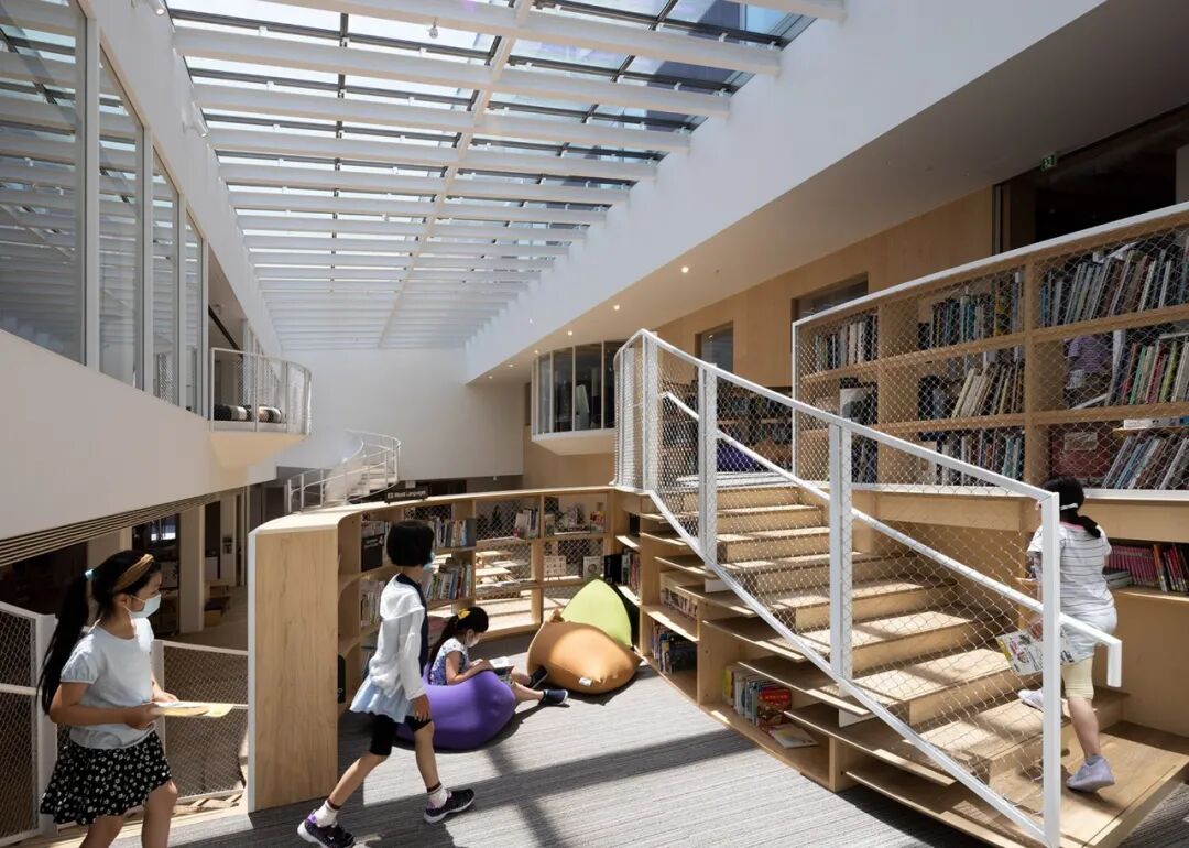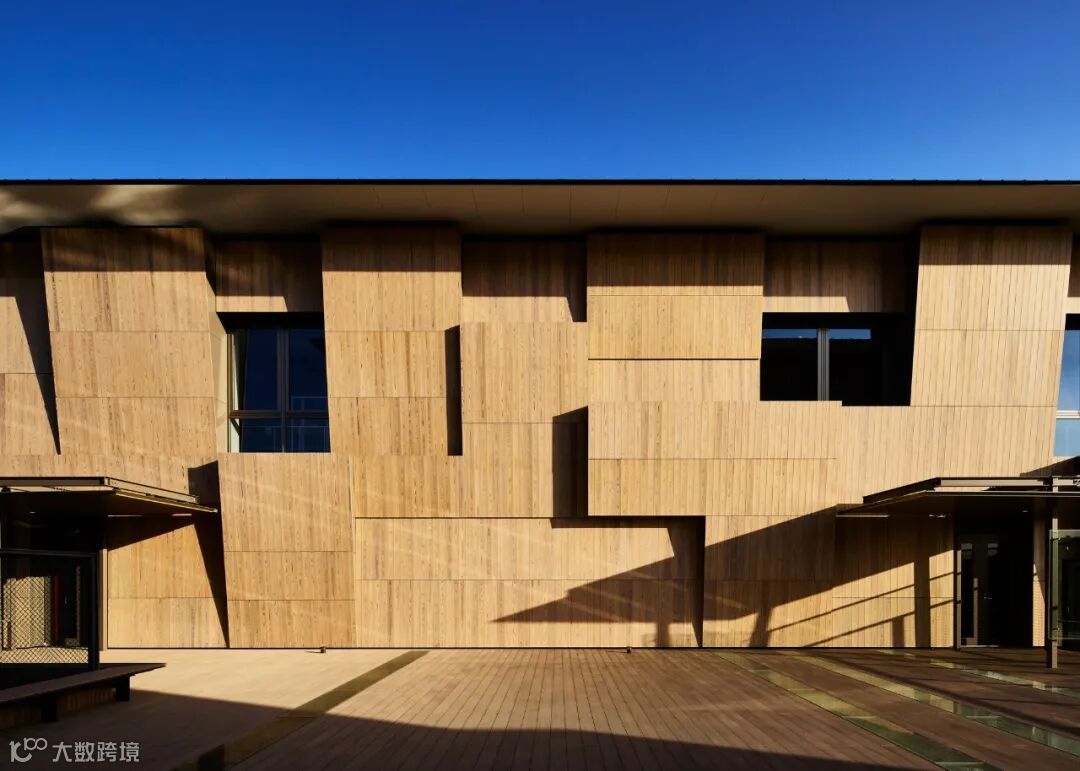 大量使用木材,创造出一个舒适温暖的空间,激发创造力。学校设施内外均采用木质饰面,如外部木板、木质甲板、图书馆和其他区域的天花板木百叶窗,以及内部落叶松墙,营造出一个温馨舒适的校园,激发孩子们的创造力。