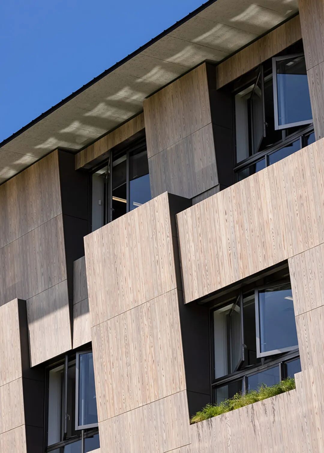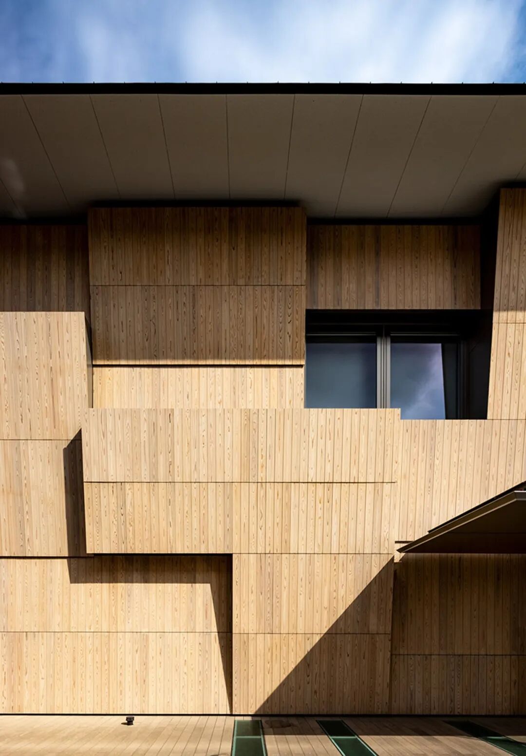 富有表现力的外部木板:学校的新标志。独特的外部设计特点是屋顶呈波浪形,大屋檐,一座连接两座建筑的桥梁,以及随意分段并略微倾斜的外部木板。这些元素使新校舍能够毫不费力地与周围的居民区融合,将以前分散的设施整合为一体。外部木板由15毫米厚的雪松木板制成,经过防腐剂和防白蚁剂处理。它们被喷涂并附着在ALC外墙外的钢架上,以根据阳光的角度创建各种表达。
