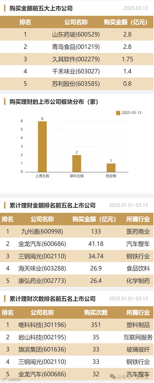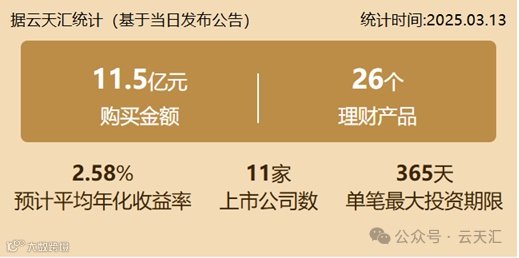 2025年3月13日,上市公司购买理财金额11.5亿元,共11家上市公司,理财产品26个。