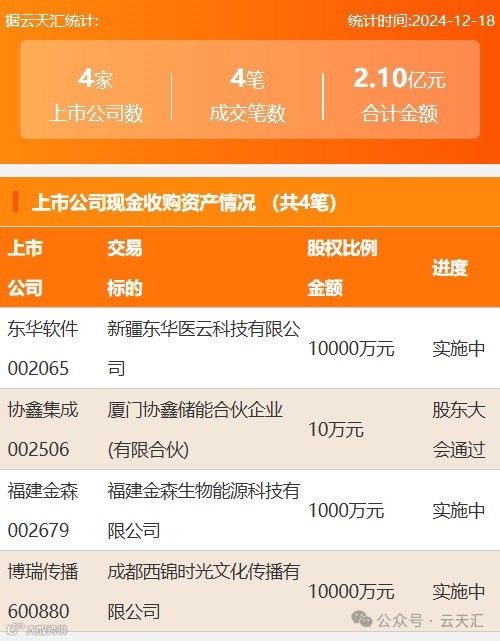 2024年12月18日,资产交易成交金额2.1亿元,上市公司4家,成交4笔,上市公司现金收购资产4笔。