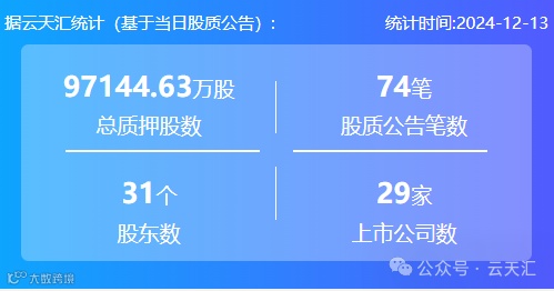2024年12月13日,股票质押总质押股数9.71亿股,上市公司数29家,股质公告笔数74笔,股东数31个。