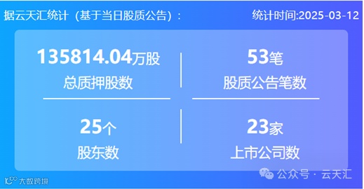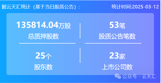 2025年3月12日,股票质押总质押股数13.58亿股,上市公司23家,股质公告笔数53笔,股东数25个。