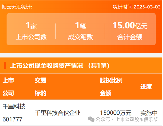 2025年3月3日,资产交易成交金额15亿元,上市公司1家,成交1笔,上市公司现金收购资产1笔。