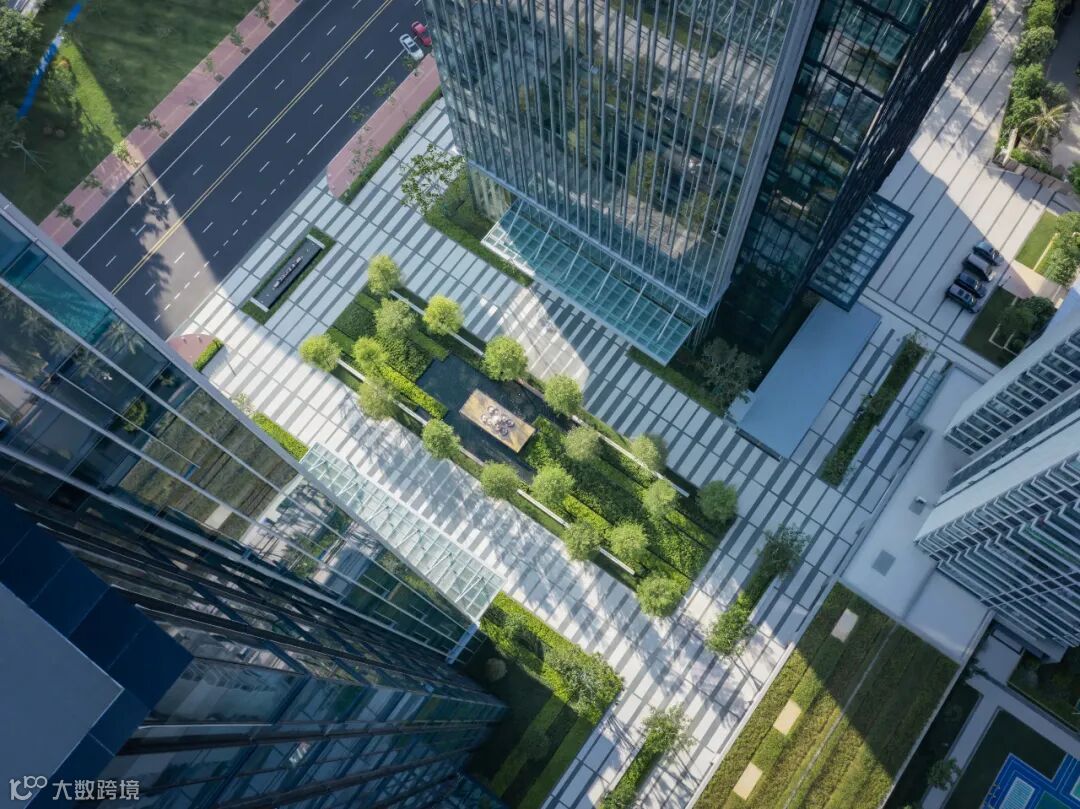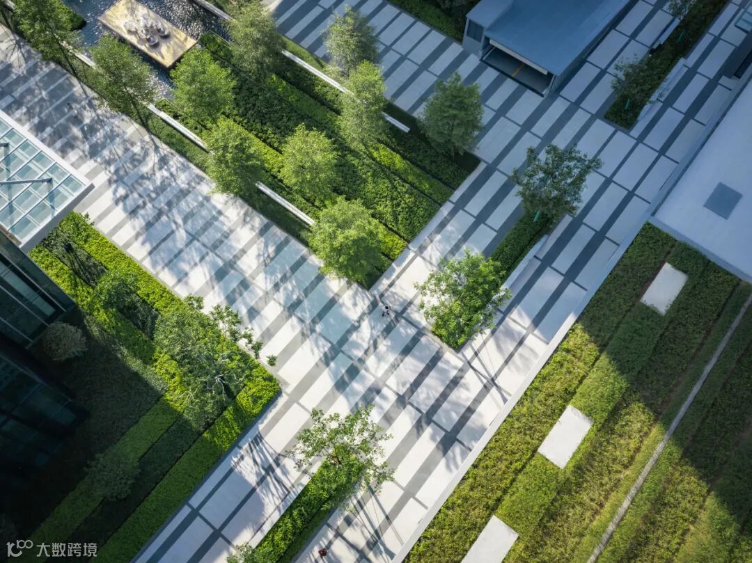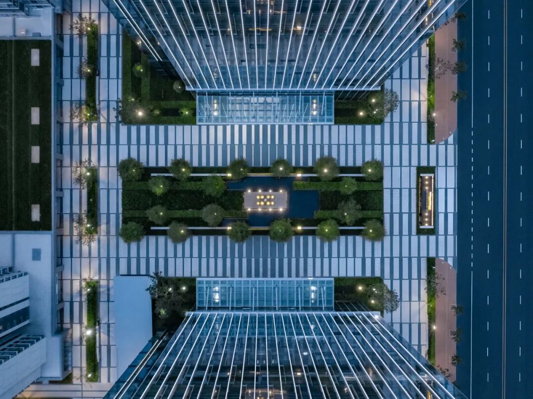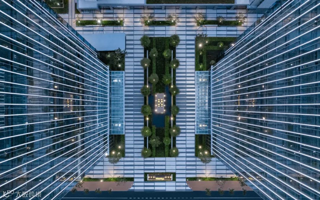 两栋核心办公建筑在场地具有很强的主导作用,简洁的幕墙搭配立面的线性肌理,形成建筑自身强烈的界面感,有效的传递建筑精神。而景观应该是对建筑的延续,与建筑形成一体化的呼应,打造办公空间的共融性。