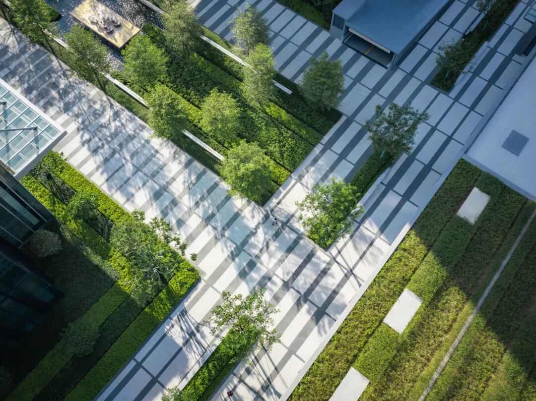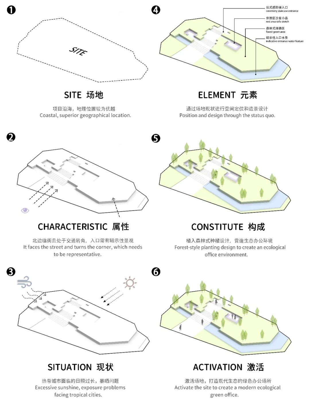 We return to thinking about the spirit of the island, take the green forest as the running hull, createing a "green boat" shape. The high-quality water platform creates the dynamic sense of driving, expresses the flowing waves with the pavement texture, and shapes the central axis theme of the "green boat" pilot, which gives the entire office park more spiritual thinking and also pays tribute to the city of Haikou.