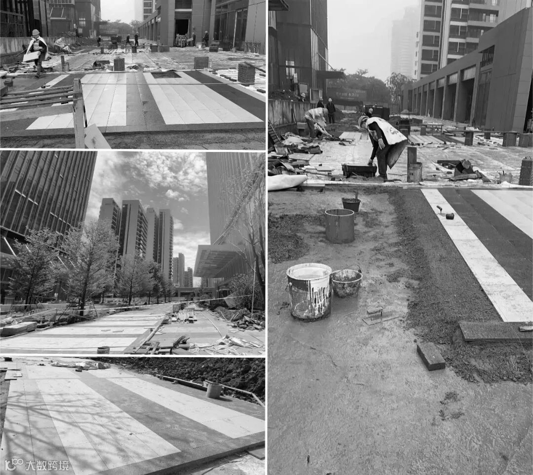 The pavement layout of the office area follows the line elements of the building facade, and adopts a method of mixing two materials in one specification.The entire office adopts a uniform paving module, and the central axis area is the center of the entire site,We used the gradient method and the principle of seam to focus on creating it,While stylish and simple, it also echoes the building facade.