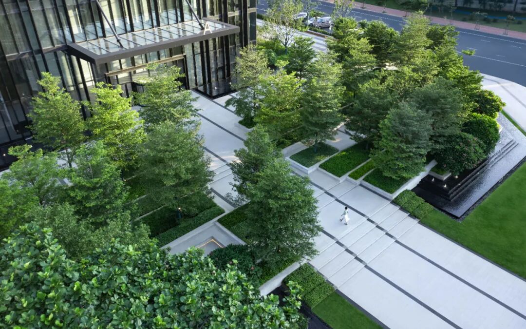 幸好我们遇到了山水比德团队,从设计创新到落地的全过程管控都给予项目很大的支持。历经甲乙双方团队反复探索及思想碰撞后,我们终于达成一致意见:营造一个海口市独一无二的森林式办公空间,于繁市中舵寻“森林绿洲”作为景观的设计主题,打造森林式写字楼景观环境。