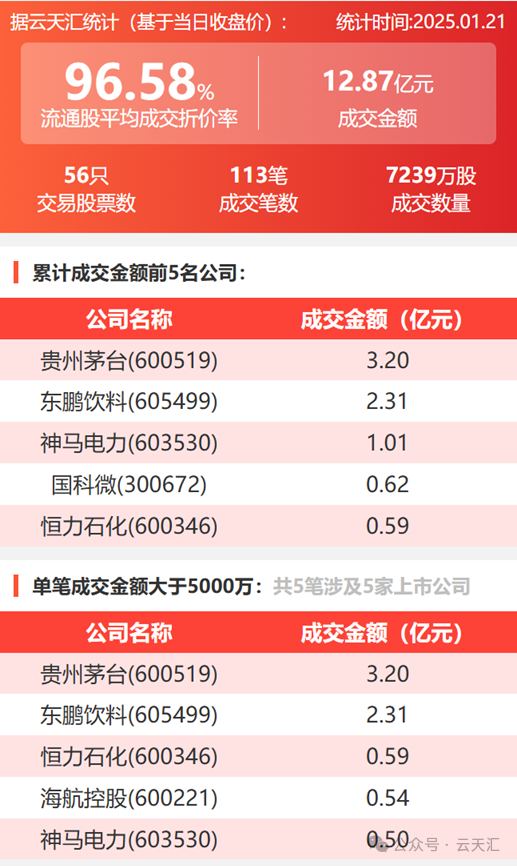 2025年1月21日,大宗交易成交金额12.87亿元,交易股票数56只,成交笔数113笔,流通股平均成交折价率96.58%,成交数量0.72亿股。