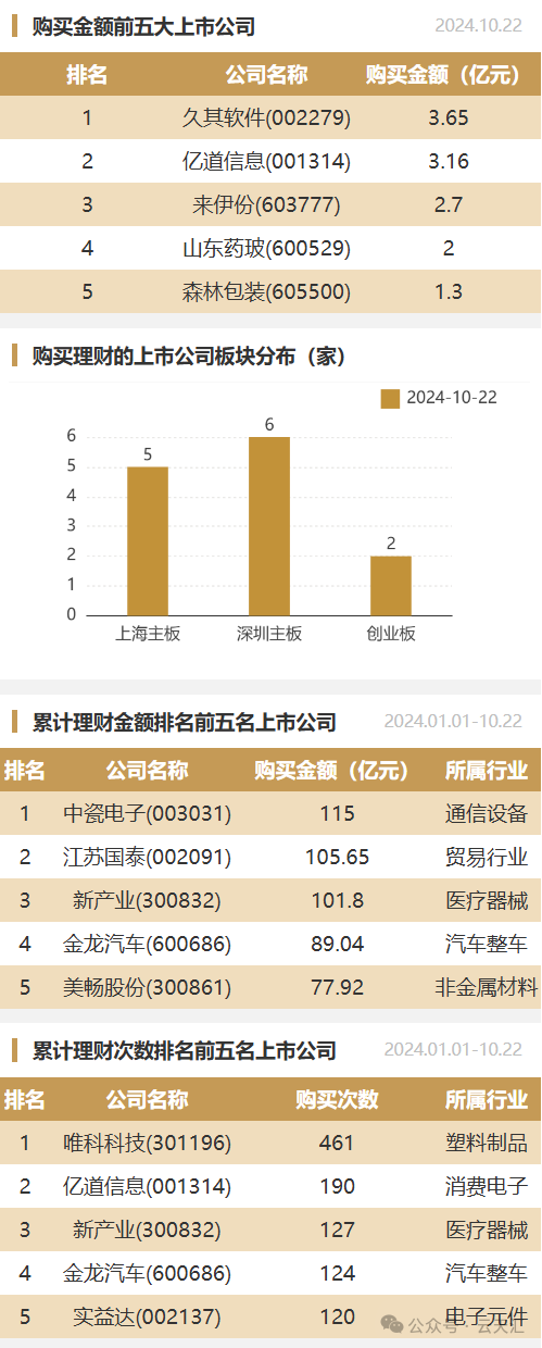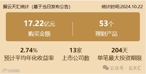 2024年10月22日,上市公司购买理财金额17.22亿元,共13家上市公司,理财产品53个。