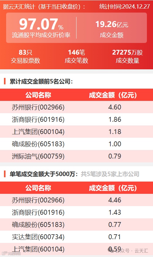 2024年12月27日,大宗交易成交金额19.26亿元,交易股票数83只,成交笔数146笔,流通股平均成交折价率97.07%,成交数量2.73亿股。