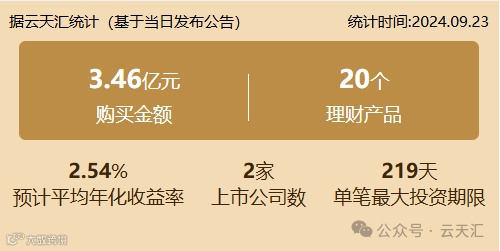 2024年9月23日,上市公司购买理财金额3.46亿元,共2家上市公司,理财产品20个。