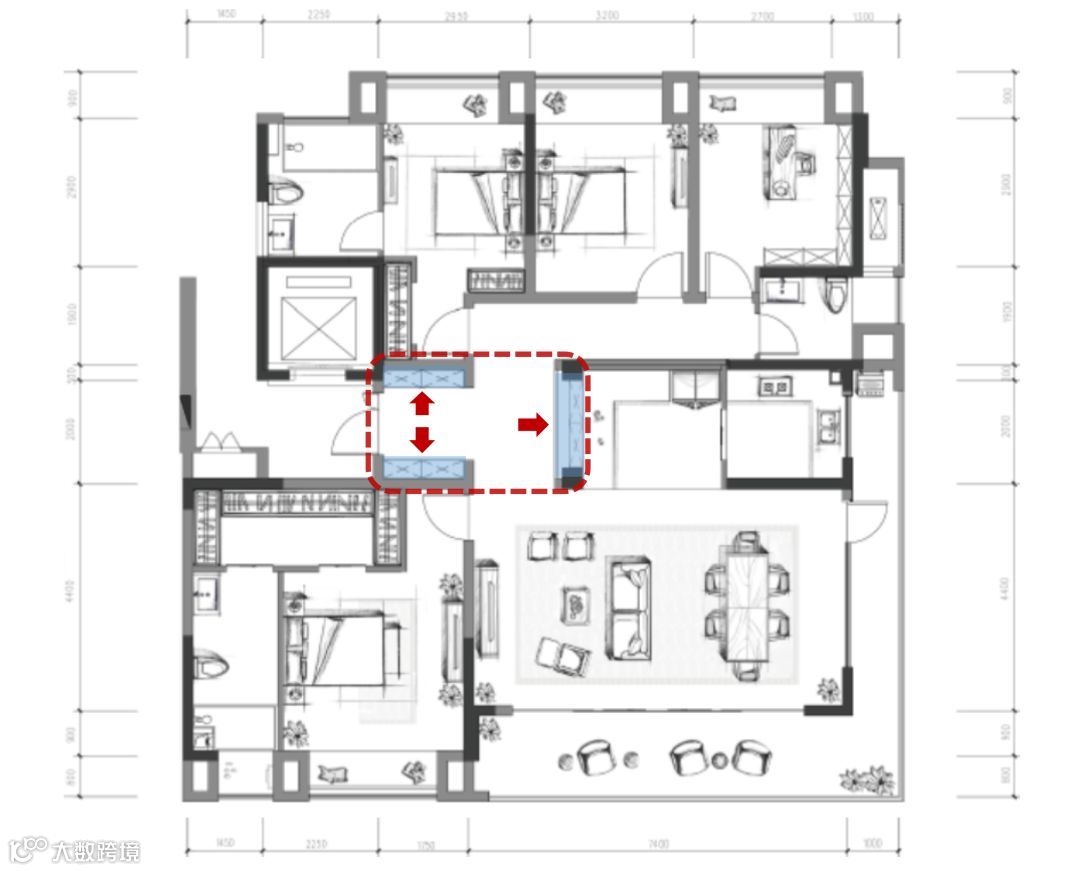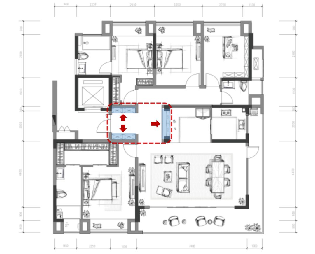 双玄关收纳体系,玄关收纳以及入户步入式衣帽间设计,紧邻电梯厅和北侧走廊,特殊时期取放防疫物资、消杀,十分便捷。平时出差、下班,风尘仆仆地回到家,也可以在外面换洗完再进入客厅,晾挂衣服,完全做到了洁污分区。