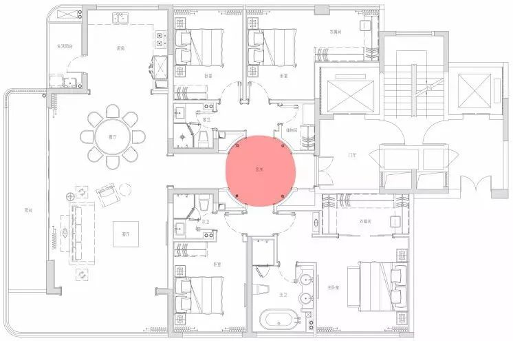 比如在锦江天玺建面约200平米户型中,一大亮点则是圆形玄关,四间卧室围绕玄关均匀排布,保证了每个卧室的私密性。
