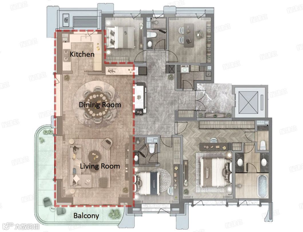 仁恒公园世纪210平方米的4室2厅3卫在做了南向五面宽的同时,还能做到双套房、中西双厨。整体开间达到18.4米,进深扣除阳台只有10.5米,横厅开间达到7.8米。