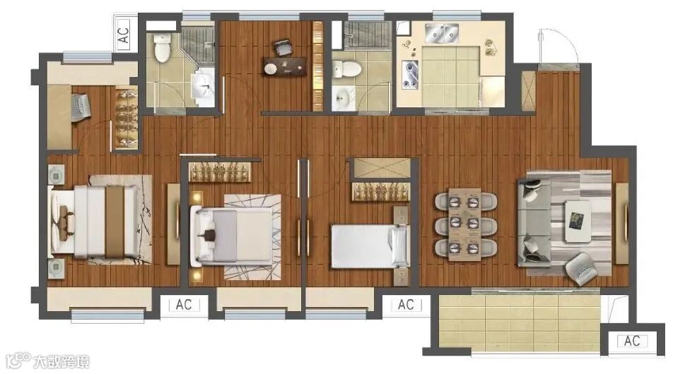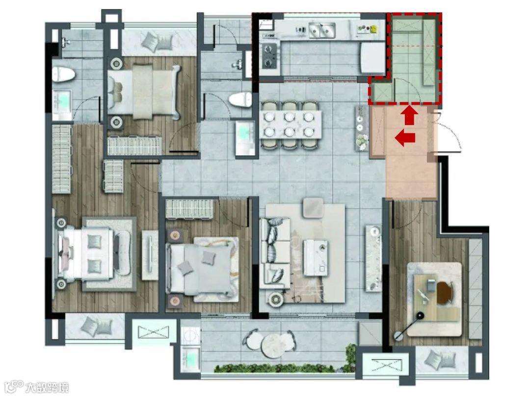 同样,贵阳·铁建城在其约240平米户型也采用了女王玄关,将四个卧室分居于两侧,注重私密性的同时还具有更强大的收纳功能。