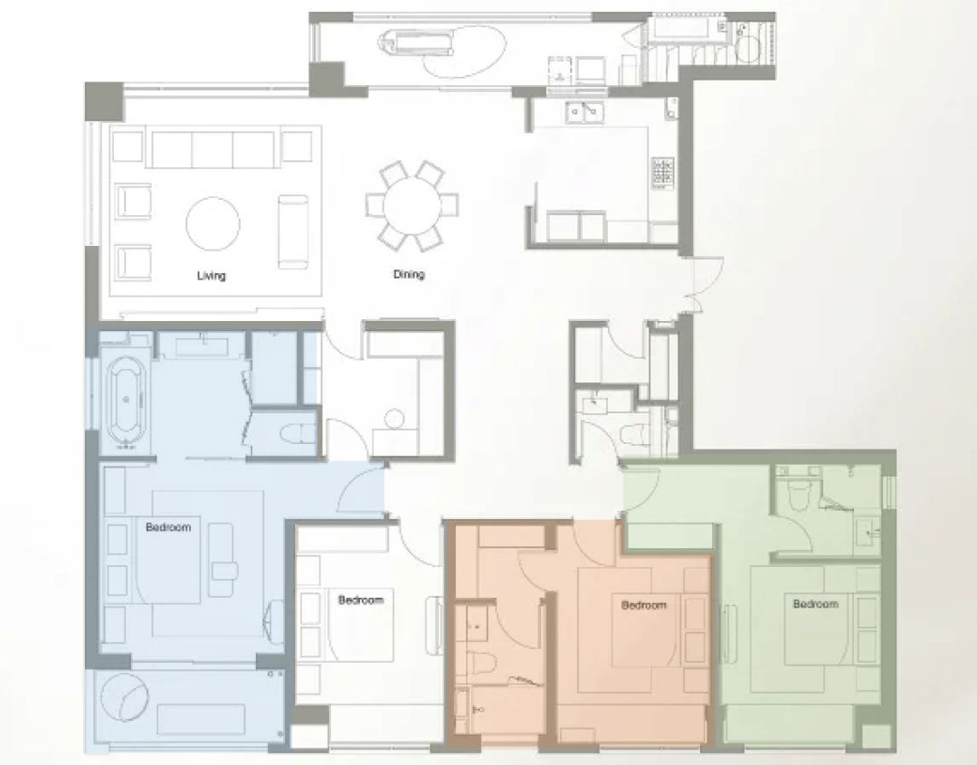 对于和父母同住的客户而言,一方面希望保持一定隐私性,另一方面也要照顾老人的居住需求。因此,双套房或者多套房设计很有必要。