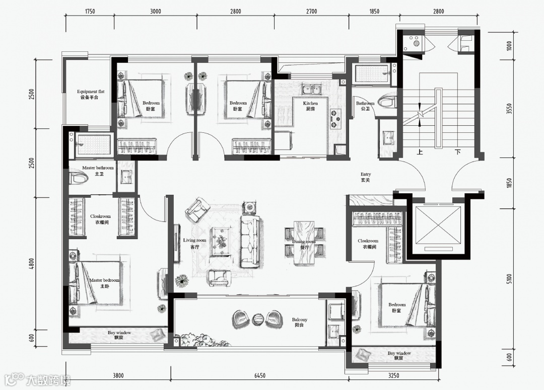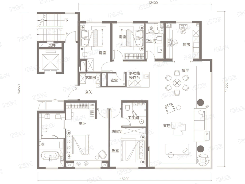 比如郑州永威上和琚221.63㎡户型,双套房设计,主卧套相当奢华,另外一个套房可以作为老人套房。