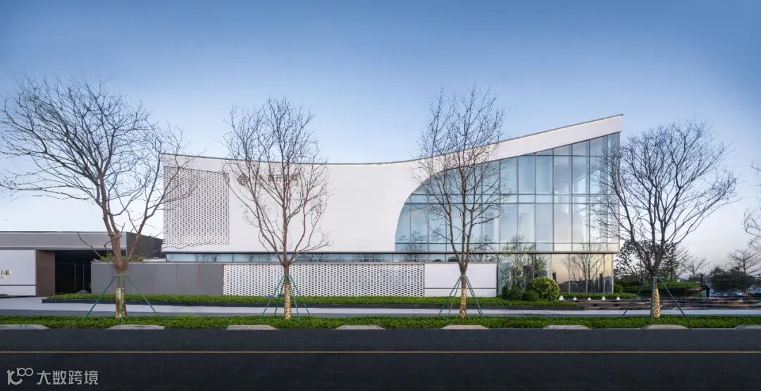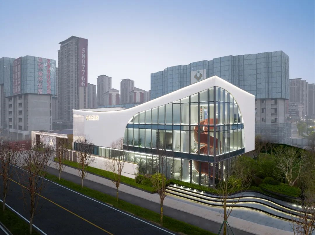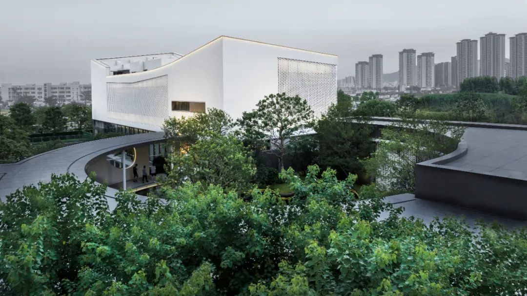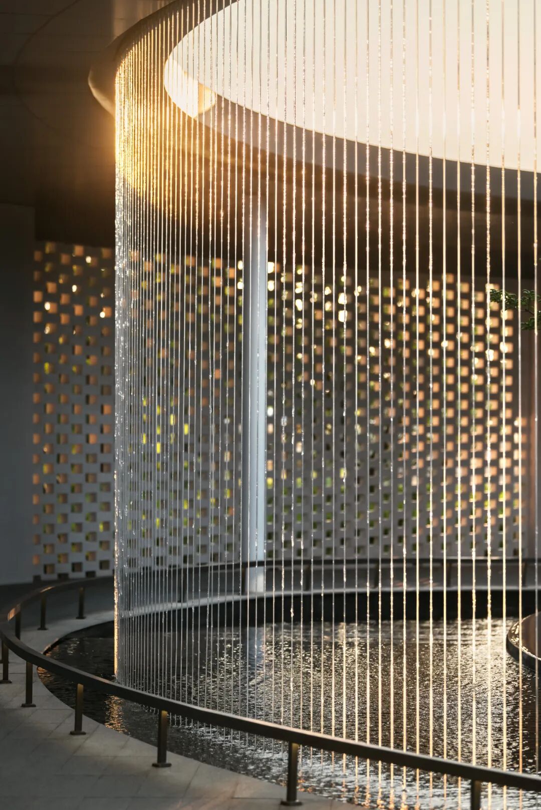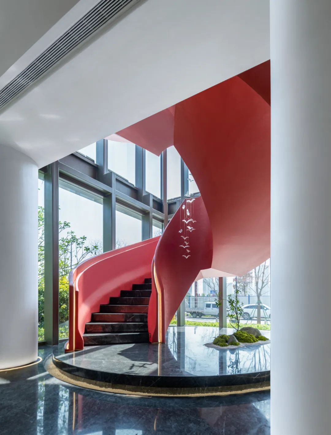极具网红属性的红色旋转楼梯被安放在建筑的转角,与建筑本身的体量形成了一个富有昭示性的界面。一个蜿蜒的水景来包裹建筑的外墙,提醒经过此处的人们停下脚步,侧耳倾听。两侧的植物和情景雕塑与建筑主景相呼应,进一步强化了界面的属性。