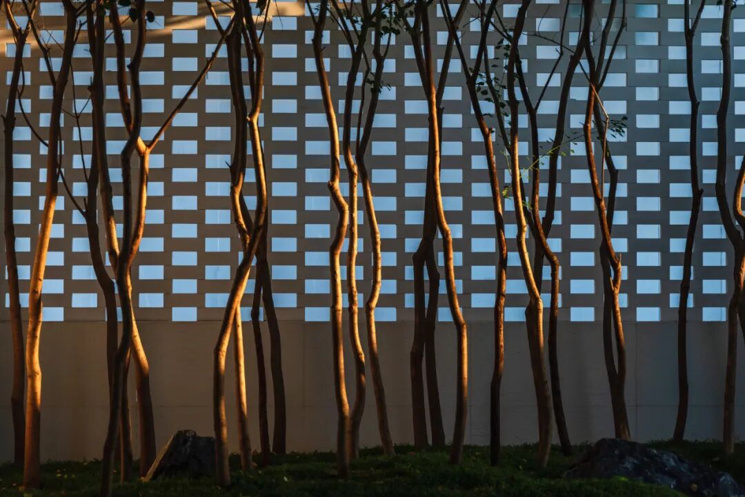 譬如针对小空间,在周边又存在着比较多的干扰和负面因素时,要想达成比较理想的空间体验。借用建筑化的一些手法似乎是一种比较有效的方法。因为相比于景观设计师更熟悉的其他元素,墙体和构造顶对于空间的界定和控制会更加明确和强烈,空间的转换也可以更加的干脆和直接。在细部层面,符号和隐喻的元素也更易于融合在整体立面之中,甚至可以通过精心的设置成为空间本身的亮点之一,本案即很好的应验了这个理论。
