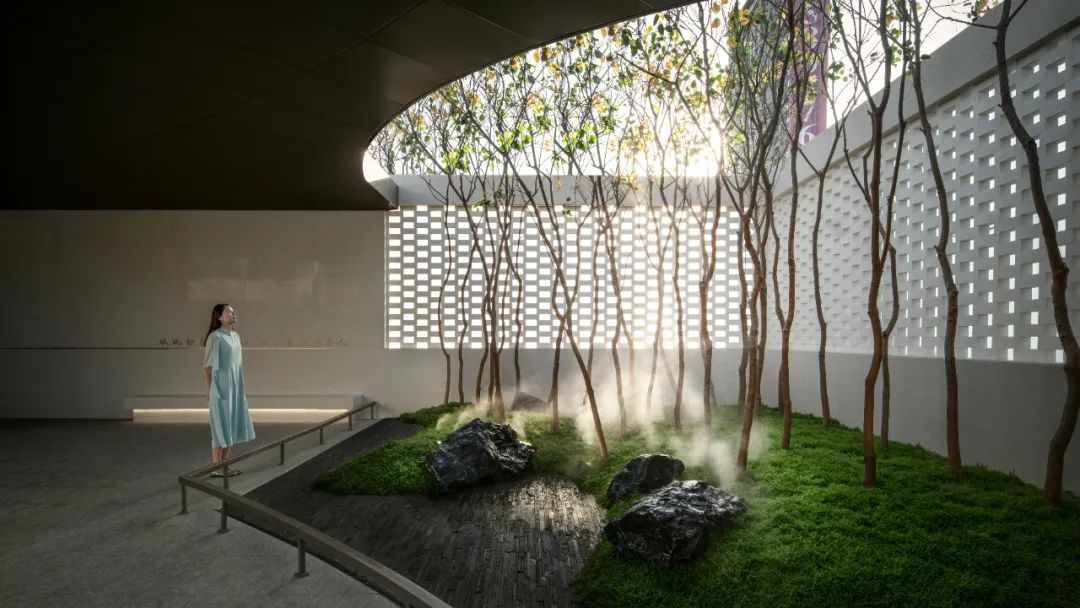 圆形的一方墨池之上,嵌入流动起伏的树池。有山有水,秀林扶疏,行走其间,让游人仿佛置身于一个立体的微型山水画之中,步移景异,心旷神怡。