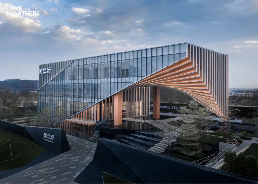 惠州旭辉 · 华宇东江公元展示中心,为了追求更好的视野,建筑尽量离开地面,示范区的设计便从东江取景展开。
