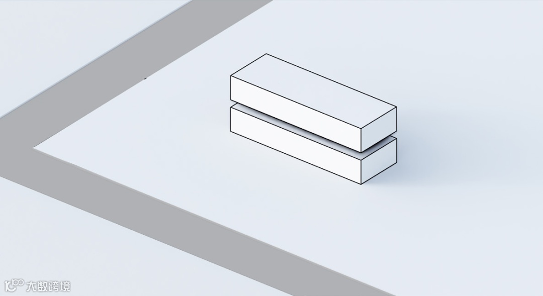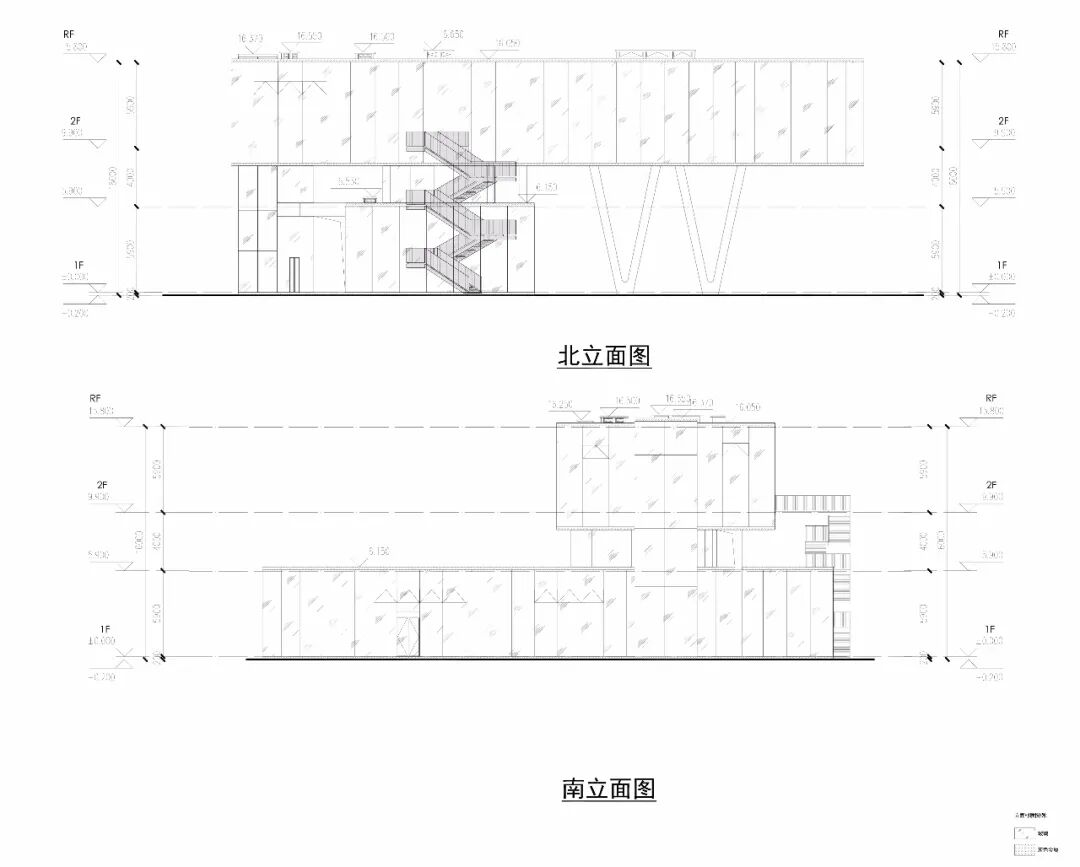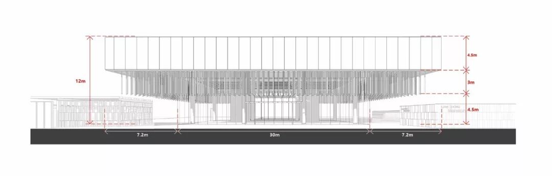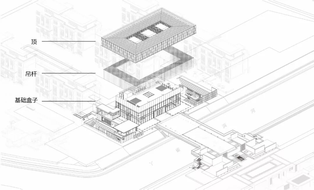 建筑基座上悬浮着三个纵向盒子,二层进行了局部悬挑,两个对称V字形支撑柱结合悬挑部分形成了建筑灰空间。