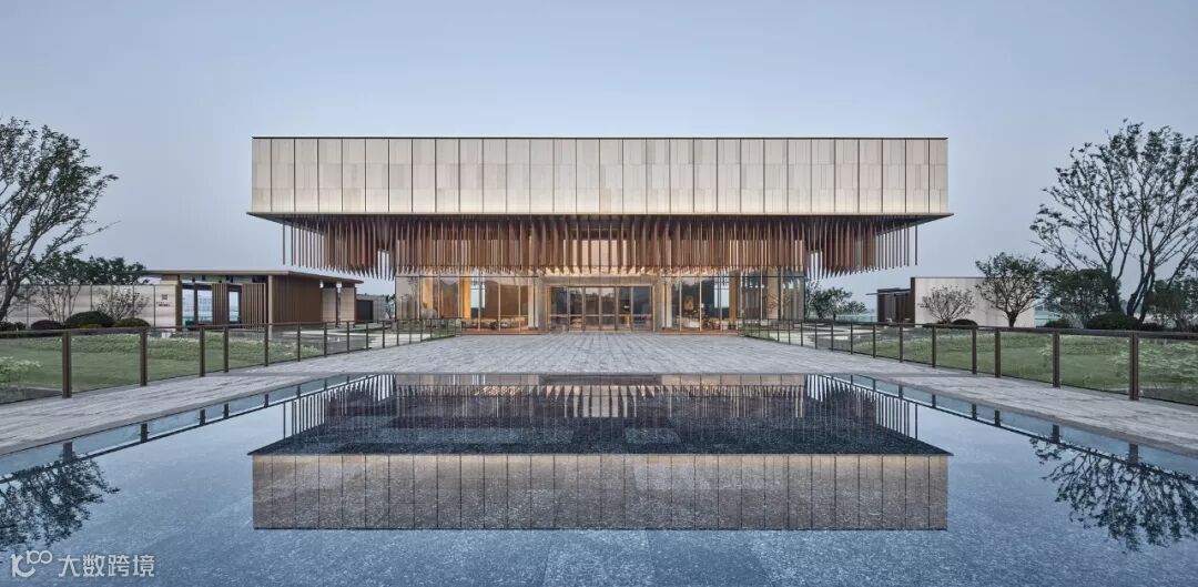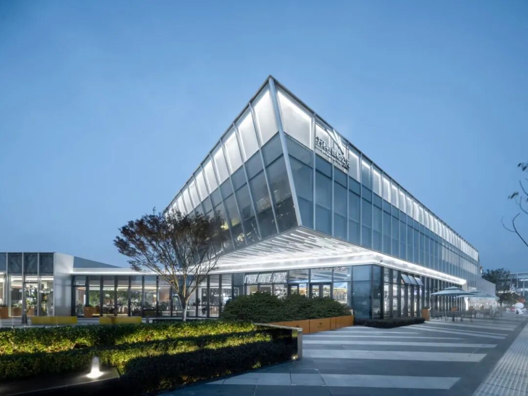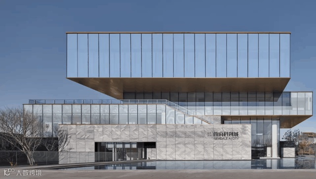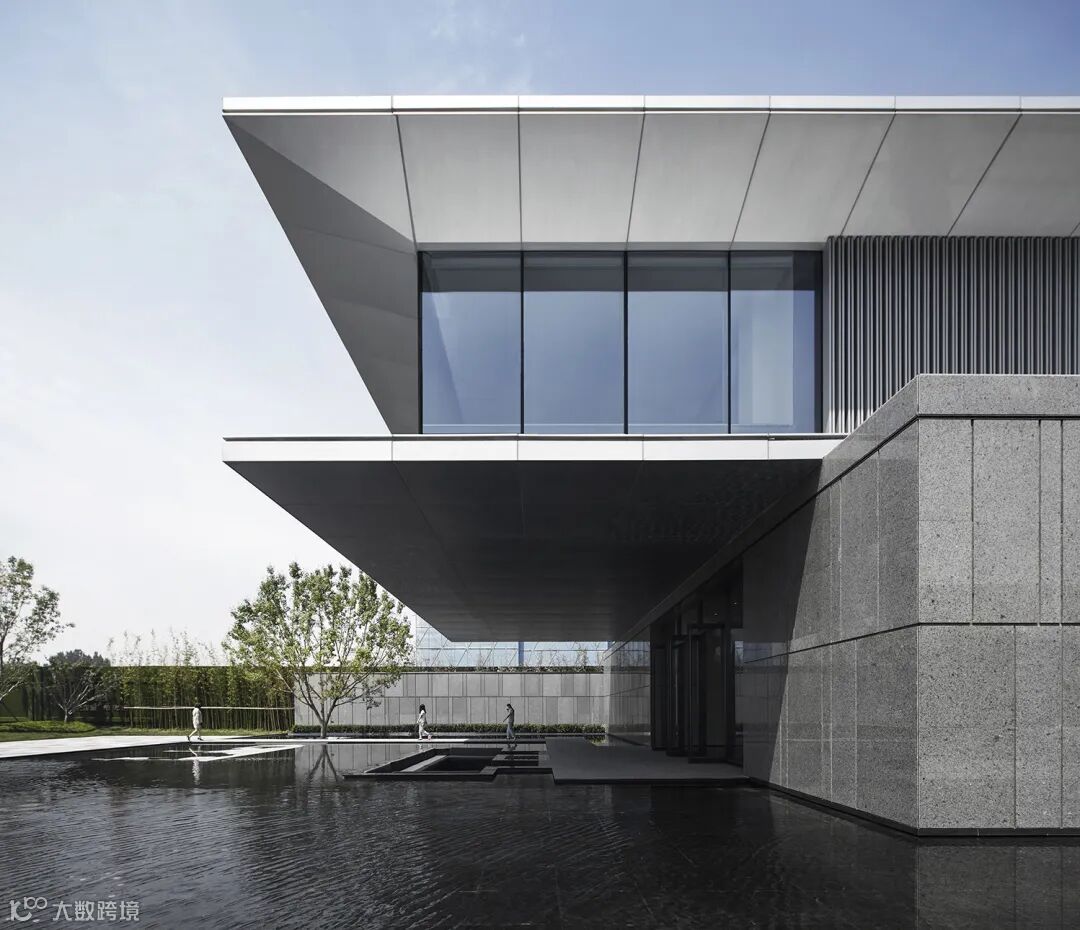 建筑尖锐棱角富有几何美学,镜面水池与玻璃体块交相呼应,通透的玻璃和镜面水池与建筑的实体形成强烈的对比关系。