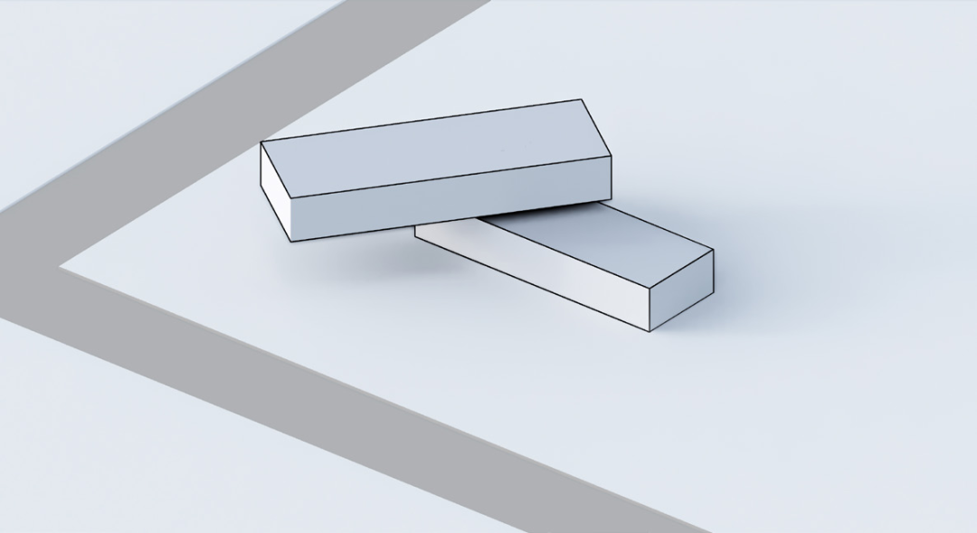 建筑体量为两层结构,功能体块通过旋转和组合,形成围合的夹角广场,竖向交通核串联整个一层二层功能空间,达到空间俱佳展示面。