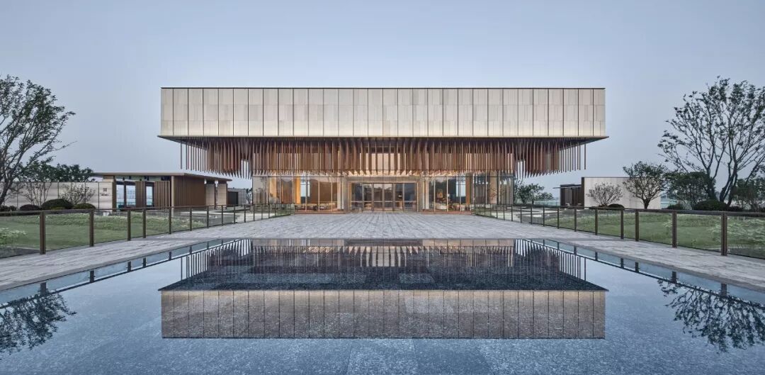 上海·联仲公馆展厅灵感来源于中国民间建筑中古老的院落门——“花节门”。设计抽象了垂直的莲花柱,以现代的方式诠释古典元素,以人文的方式传承文化。悬挑的屋顶创造出深度,使整个建筑形成沉稳的氛围。