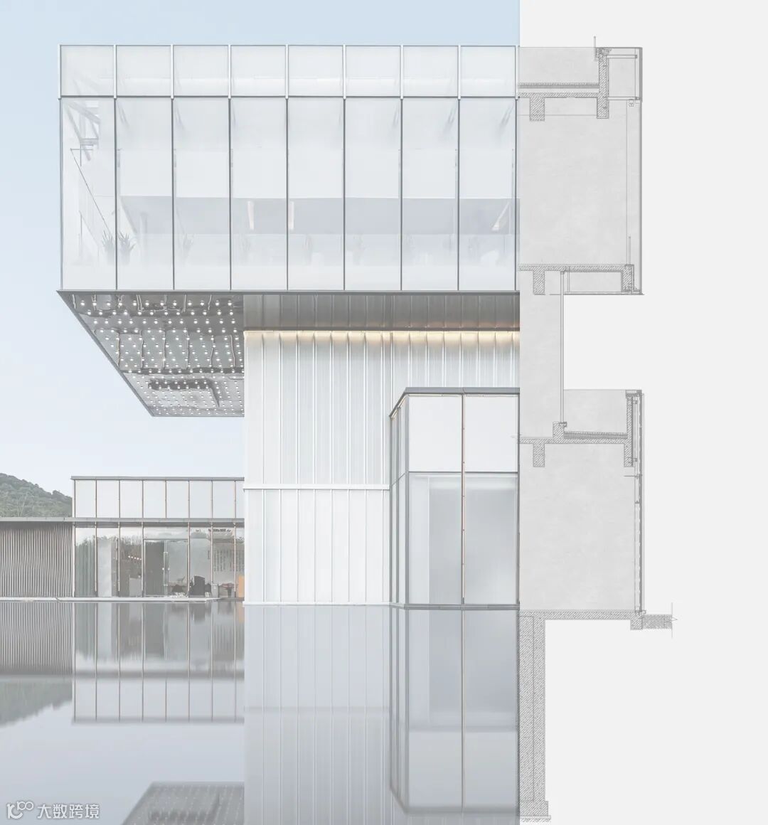 玻璃盒子的观湖界面形成悬挑空间,三个玻璃盒子采用不同材质,底层采用透明玻璃和银灰色铝板结合金属框,形成开放的入口迎客空间。二层喷砂超白u型玻璃和白色铝压条,与三层的透明玻璃结合镜面不锈钢横向檐板,上下错动,形成简洁通透、雕塑感的建筑形象。