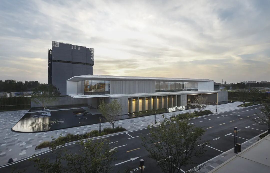 固安孔雀城柏悦府—示范区接待中心建筑的两层体量通过叠合错动,单向悬挑形成了富有视觉张力的建筑形体。