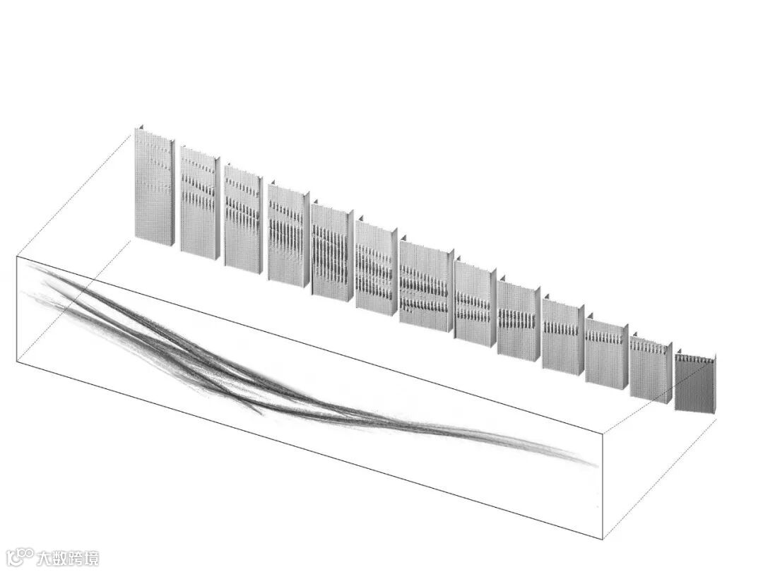屋顶通过特征粒子点的轨道线重构及放样得到初步的直纹曲面,并通过传统建筑坡屋顶中的“举折之制”,将曲面几何用由下至上坡度逐渐变陡凹曲屋面拟合,使其既具有结构上的合理性,也形成了于中国传统坡屋顶建构方式的传承与呼应。