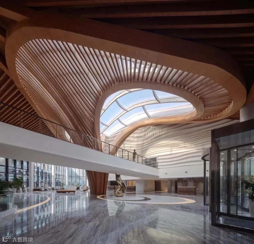 A single column blooms in the lobby. Entering the lobby of Radisson Hotel, the project intends to continue the sense of “long-distance” traversal, wishing to guide people at the end of the lobby through the floor-to-ceiling windows to take in the focal point of the Expo Park, the “Jingyang Tower”. Meanwhile, the general plan adapts and extends the winding interface, and draws on the landscape so that it can also take in the meandering road, water system, deep valley, hidden mountain, and lake. The lobby space echoes the concept of “one tree becomes a forest” at the entrance, and through the coupling calculation of structural mechanics and morphology, the double curved roof space intention of “one column blooms” of nearly 2000 square meters is realized. The topological continuity concept integrates the column and beam structure of the lobby, and the concept of a “blossoming column” is developed by the topological configuration of one point four. The overall roof force is integrated through the integrated design of the curved beam and column to achieve the goal of integrating “shape and force” to find the shape. The design was simulated by kangaroo dynamics to find the shape of the “blossoming column”, the main force structure is composed of steel structure, and the secondary curved beam and column system between the main structure is intervened by wood structure. The final overall structure was optimized by nodes to achieve the integration of form and force, light and space. The “blossoming column” is not only a structural body but also an important source of light for the core space of the interior, naturally extending from the roof to the ground, with sunlight spilling in through the gaps in the wooden beams. Sunlight pours in through the gaps between the wooden beams, extending the sense of “openness” from the entrance eaves to the interior atrium.