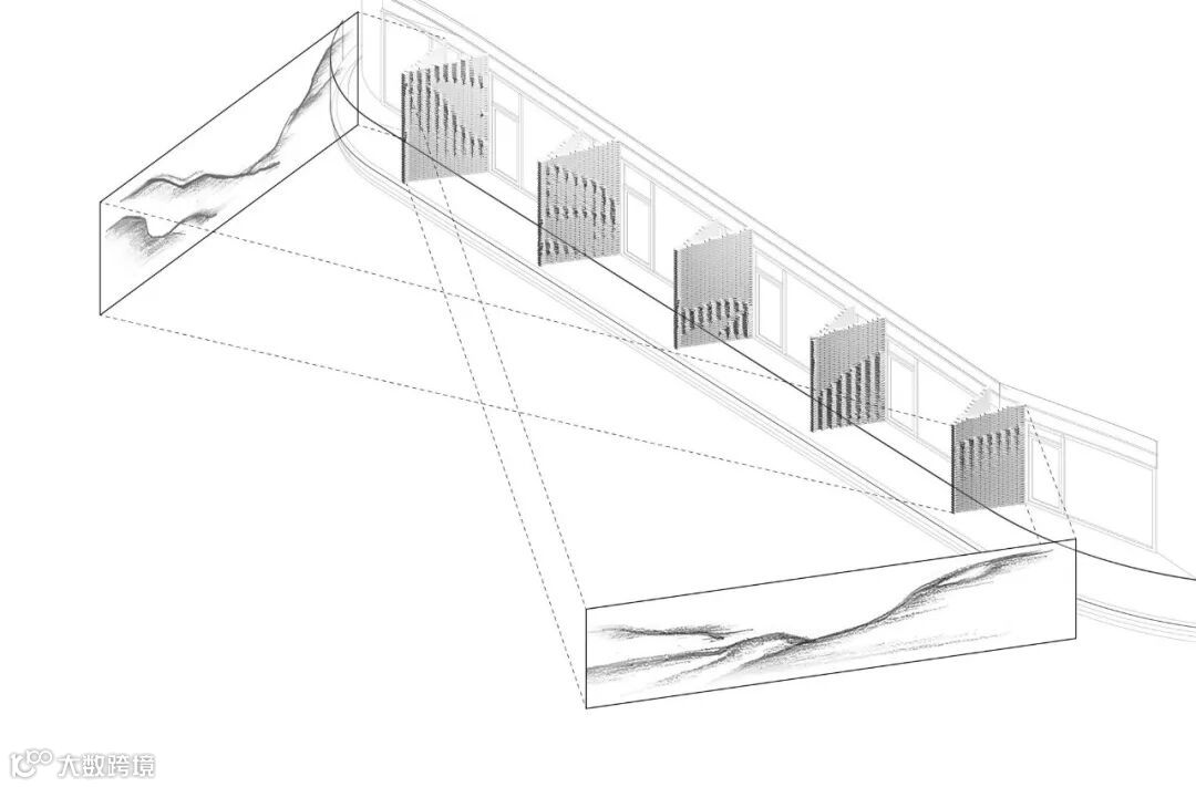 但形态上的最优解却由于屋面的木结构属性在建构层面举步维艰。最终通过结构师配合,在屋面上压堆载平衡找形后利用两根钢索完成了跨度28m、平均进深8m的无柱张挑檐廊结构,钢索下垂的姿态不仅优化受力,亦使檐廊产生了更为优美的意蕴。入口有意预留的无天沟挑檐,由于凹陷的形态在雨天形成水瀑跌落,与入口的孤树和水池产生了自然而优雅的场景互动。
