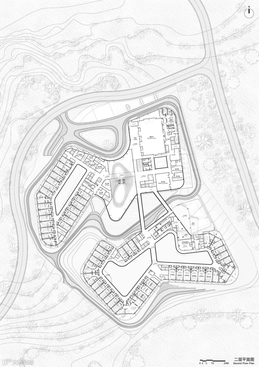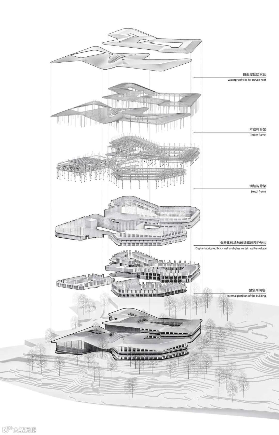 丽笙酒店整体体量依托于大地的几何语言,15米的场地高差塑造出层叠盘绕的大地风貌,方案生成顺势而为,依托地形将场地分为南北两大功能区。