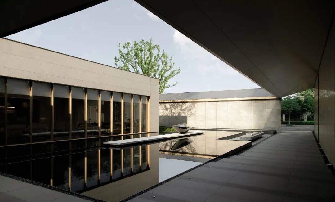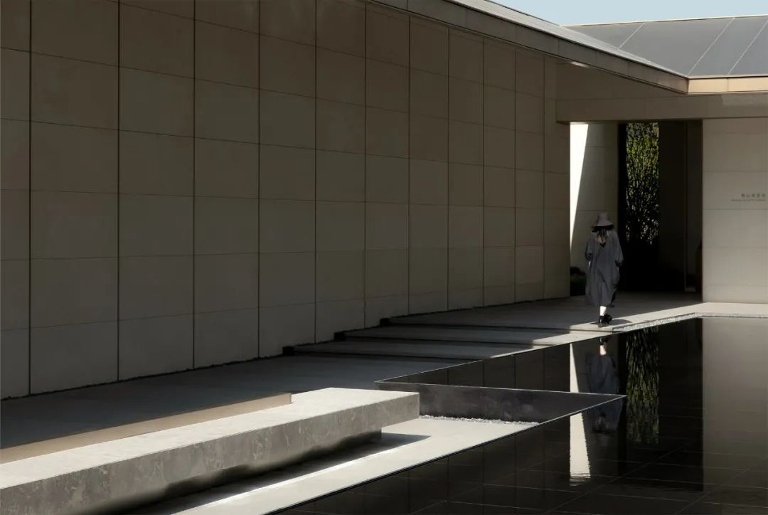 公共领域,保持了开放和自由的动线,无论是行走或驻足,人们可以匆匆而过也可以小憩静思,阳光、疏影、长凳、灰空间、似乎漂浮于水面的有型无相的现代雕塑,灰青的色调略带暖意,庄重而不乏惬意,建筑与景观浑然一体,完美的相互渗透形成了一个独特的水院。
