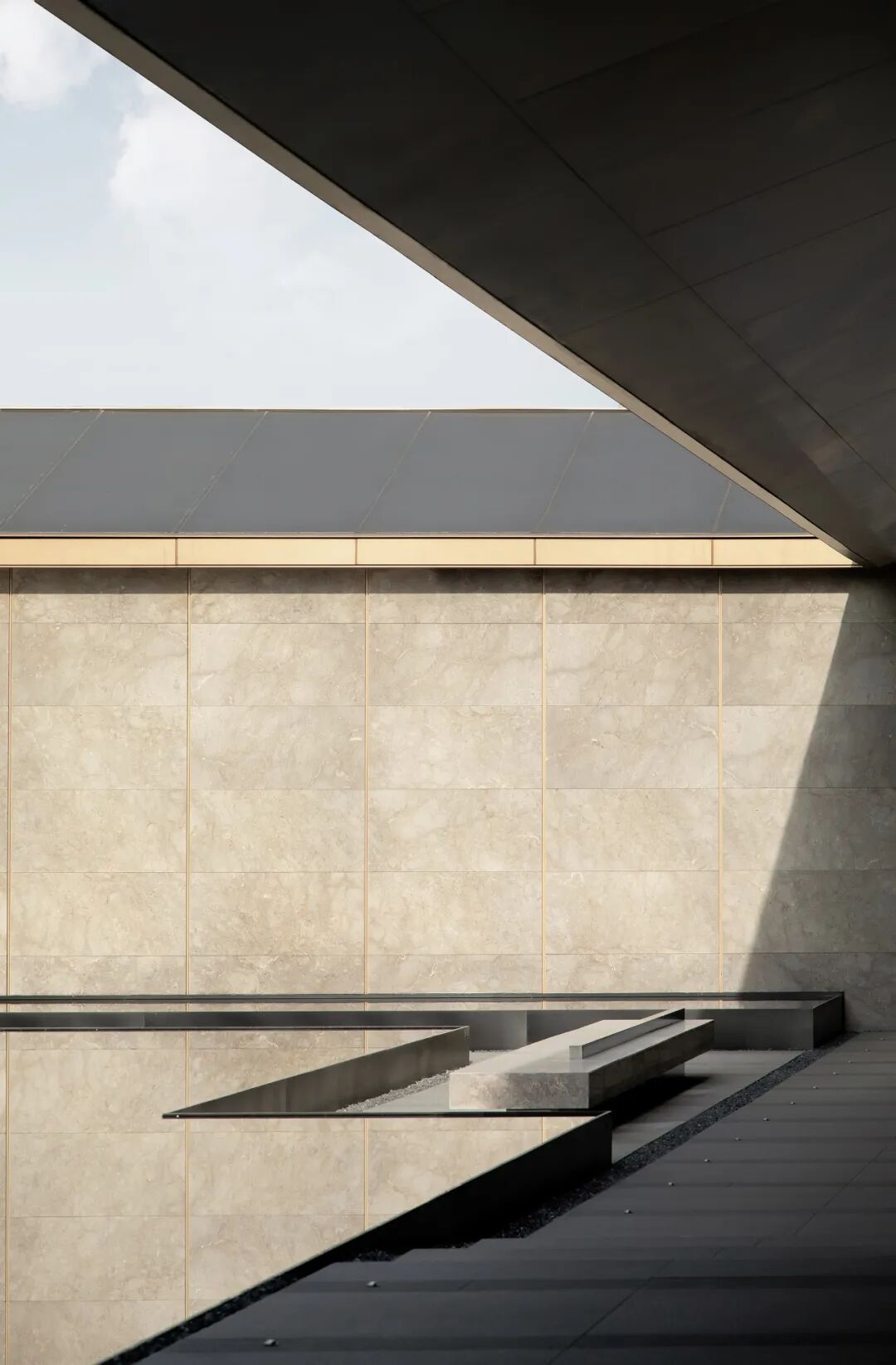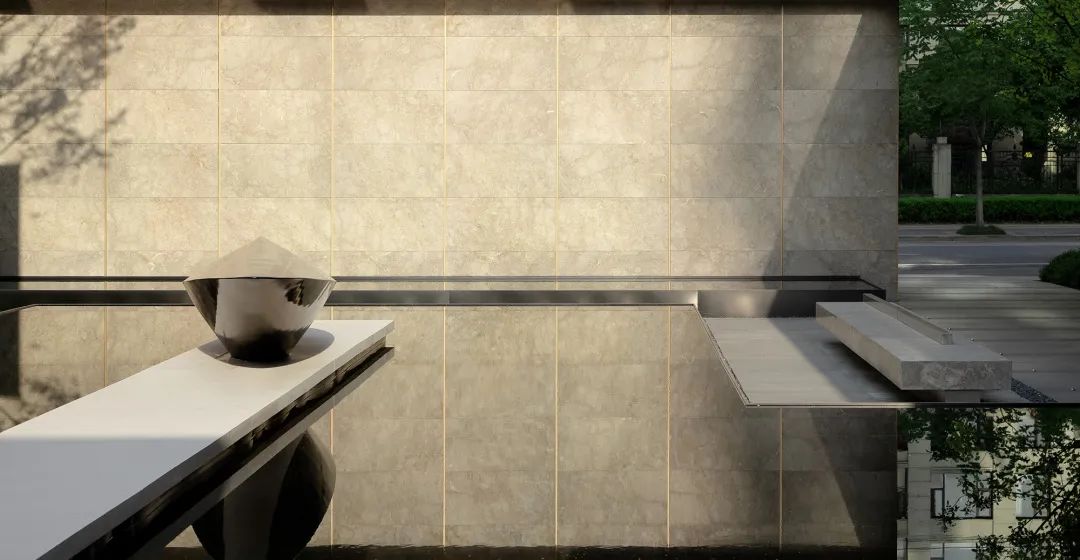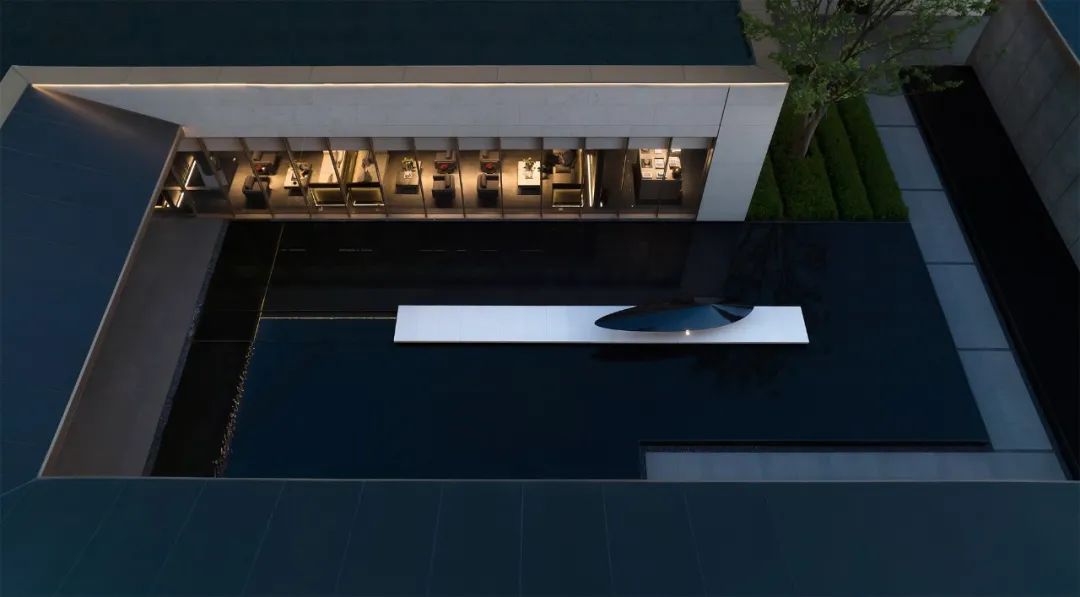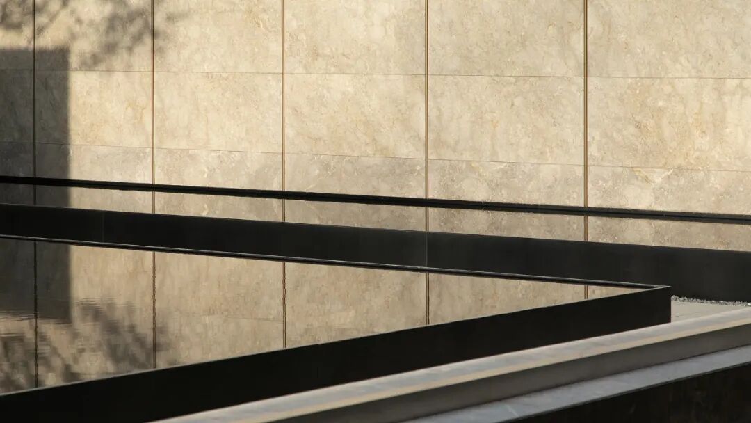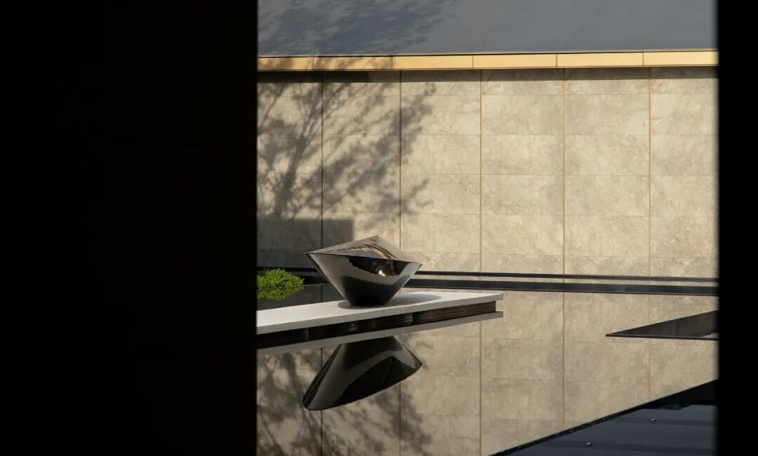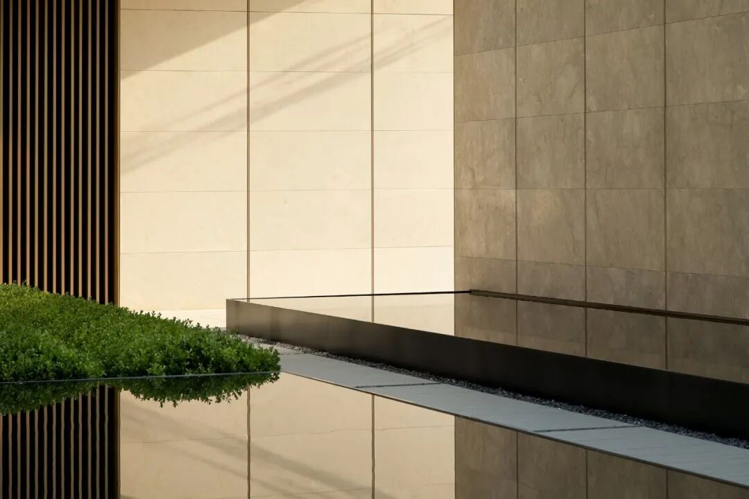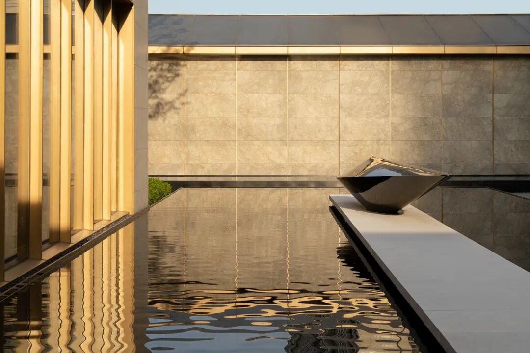 当金属与石材勾勒出简洁的体块,与水景互构成咬合的关系,光即层层浸润,隐然建立起距离间隔的幻化,若虚若实。
