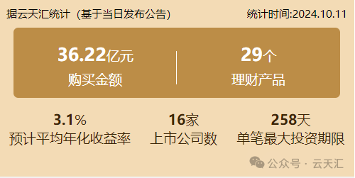 2024年10月11日,上市公司购买理财金额36.22亿元,共16家上市公司,理财产品29个。