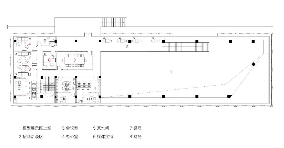 营销中心首层设置对外性质的功能,包括模型展示区、接待区、洽谈区、服务配套区。二层设置办公区、会议区、观看区、配套办公区、观赛长廊。通过合理的平面布局,实现了动静分区、内外分区,以及功能、造型、开窗的一一对位关系,体现了功能与形式的完美统一。