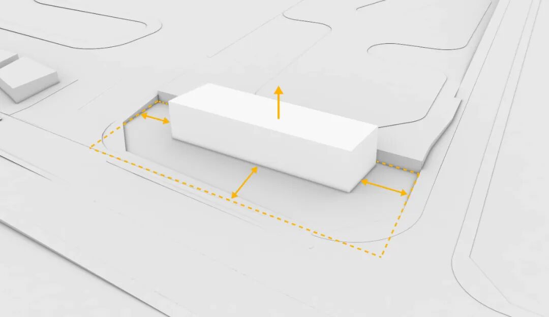 项目处于城市道路的交叉口、汽博园园区的主入口,用地小而狭长,竖向高差大,新建建筑进深不得超过15m,并且需要考虑为东侧赛车场提供赛事观赏的场所。方案初期的想法是将营销中心设计为一个长条形的盒子,建筑呈“一”字形展开,平行于西侧城市主干道,与赛车场地和城市主干道之间形成相互平行的简洁关系。