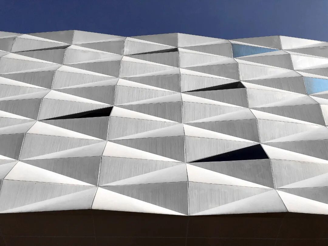 采用汽车造型的流畅化线型设计、灰白的材料打造了一座时尚非凡的建筑。对外立面进行标准化、单元化的设计,使之达到极简主义的效果。在菱形白色标准铝板材的形心处拉伸一个量值,使立面形成丰富的凹凸关系;结合功能需求选择性地对外立面进行开窗,使虚化的三角形窗零星地点缀在外立面上,在阳光的衬托下,呈现出“鳞”动的光影效果。