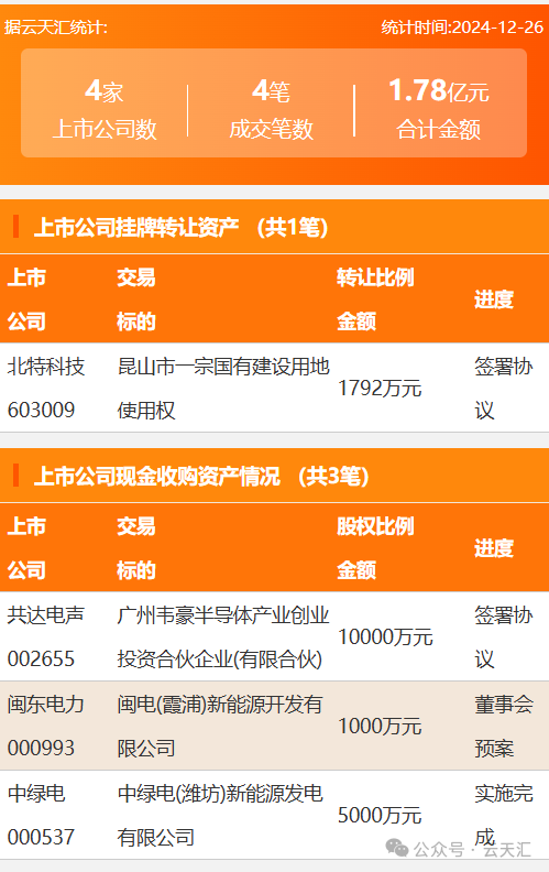 2024年12月26日,资产交易成交金额1.78亿元,上市公司4家,成交4笔,上市公司挂牌转让资产1笔,现金收购资产3笔。