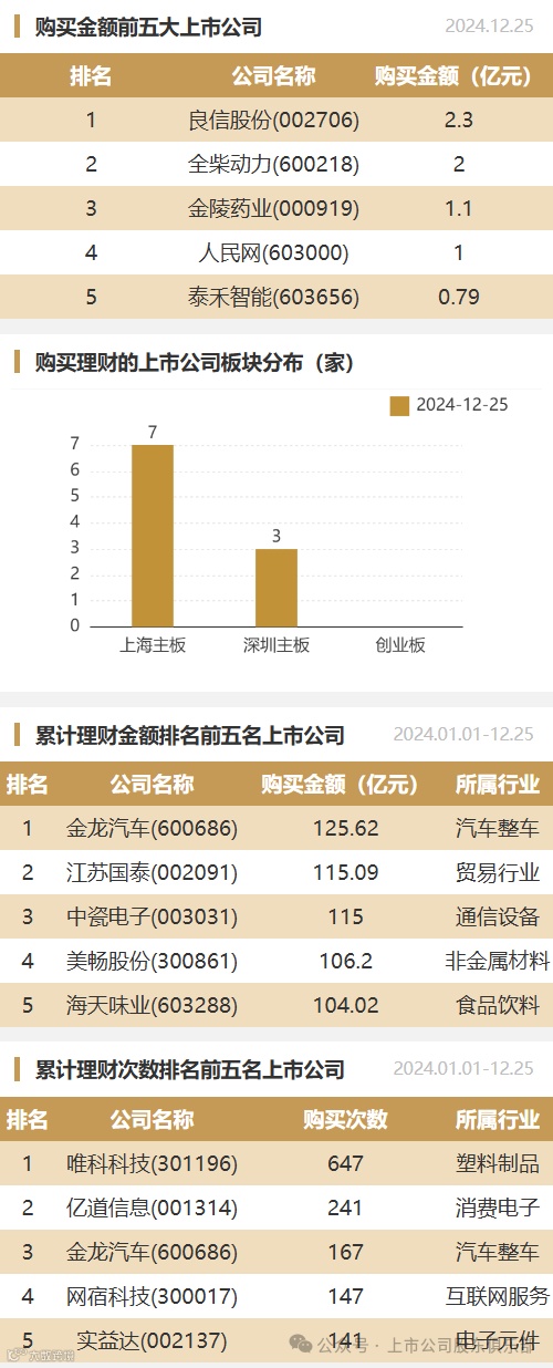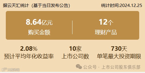 2024年12月25日,上市公司购买理财金额8.64亿元,共10家上市公司,理财产品12个。
