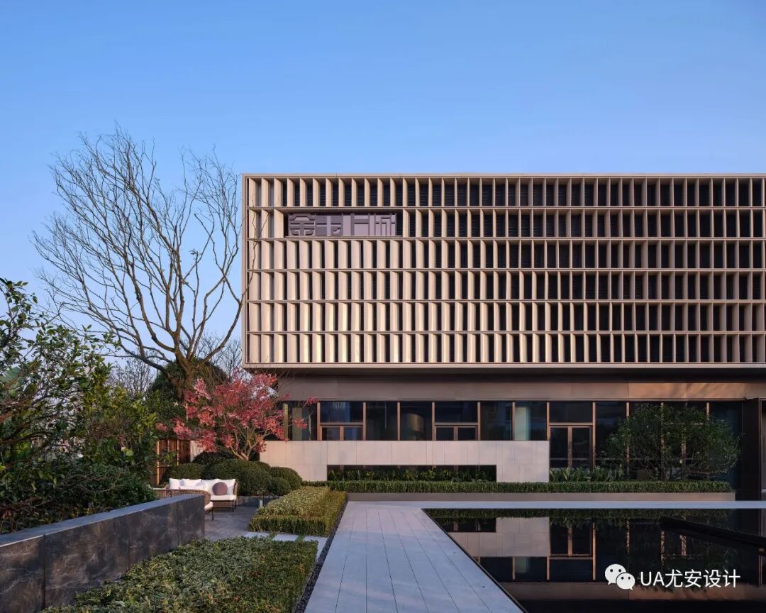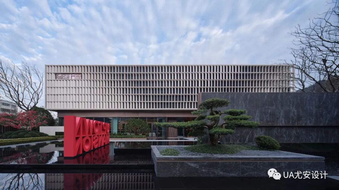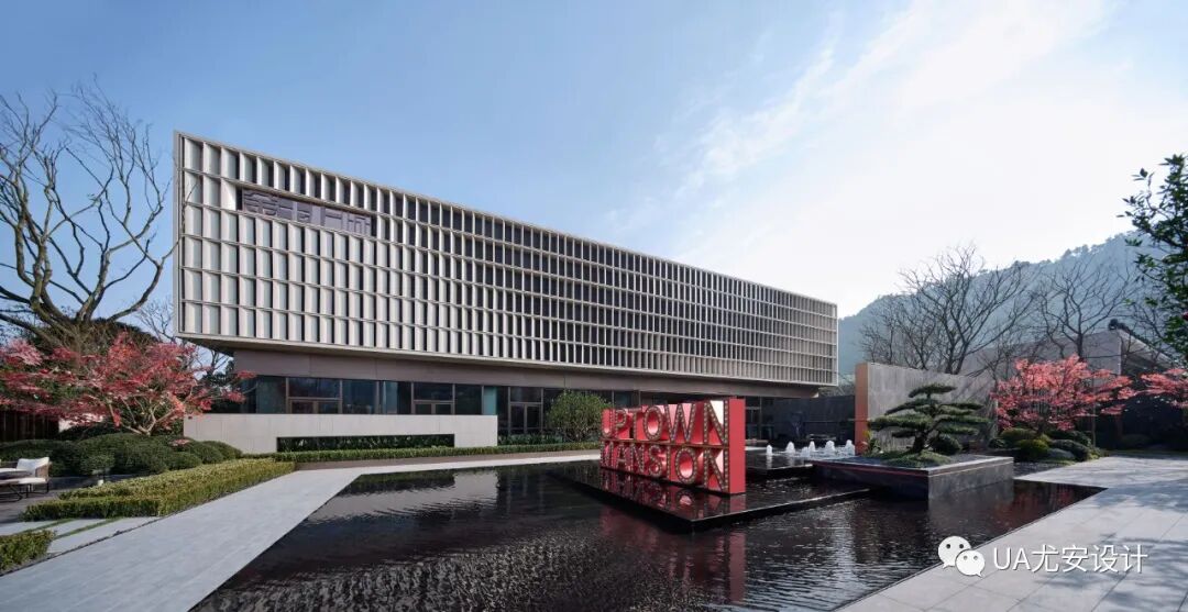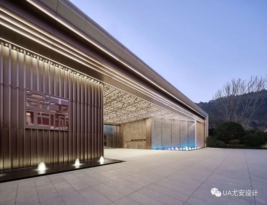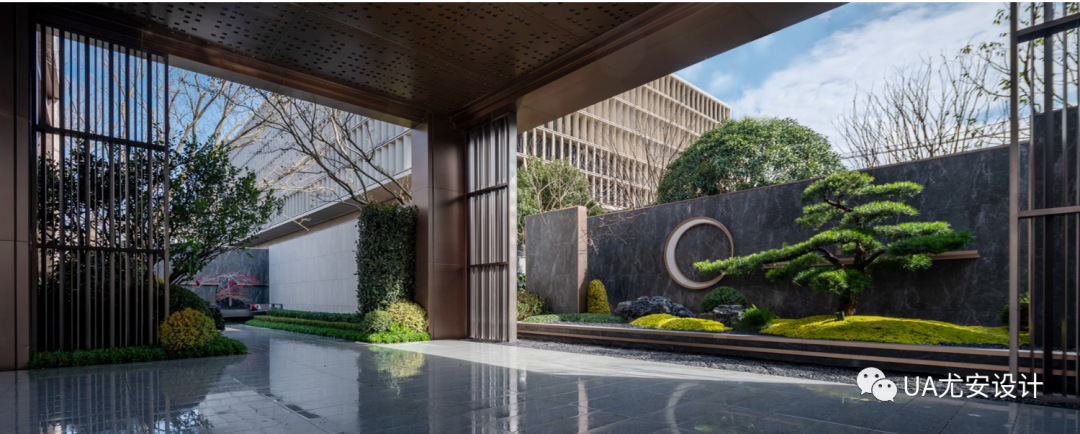 前场空间以江南园林“曲径通幽,移步易景”的造园手法为主轴,并通过现代空间的引导、转折、虚掩、围合,形成“明月松间照,清泉石上流”的空间意境。从停车区通过引导空间,进入入口广场,穿过景观门廊,步入转换空间,再通过过渡空间来到核心水景,最后进入展示中心。流线清晰,一气呵成。