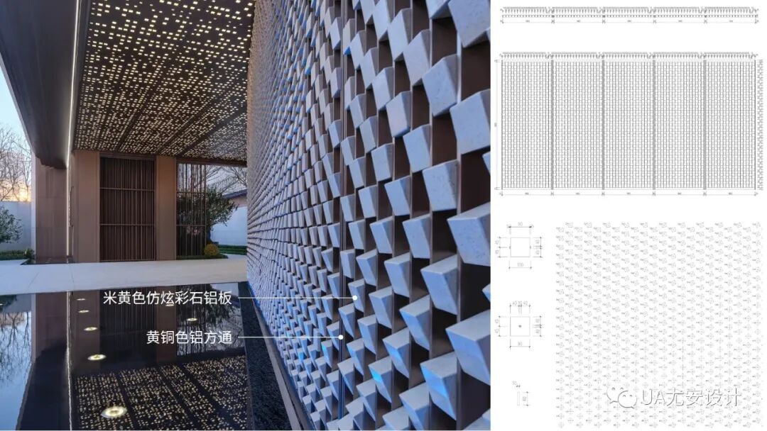 同时,为强化示范区在城市主界面上的记忆点,设计对主入口景墙进行近人尺度的参数化设计,并融合黄铜色铝方通和米黄色仿炫彩石铝板材质,展现标识性立面语言。
