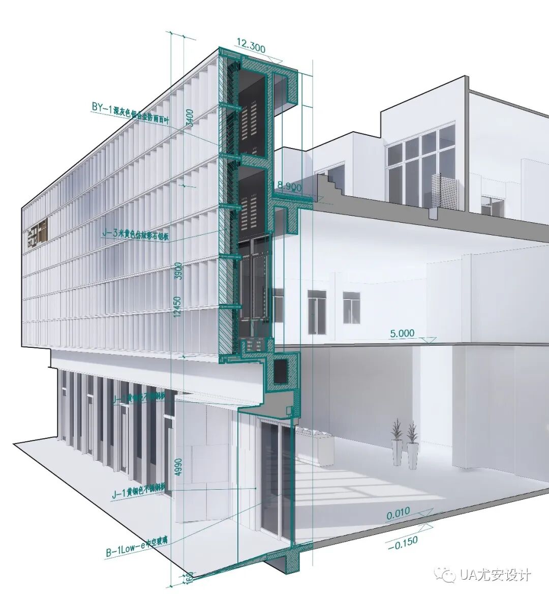 立意成形后,设计如何让静止的建筑“舞”起来?是否存在一种表皮系统,既能满足功能需求又能达到效果展现?经反复推敲,内部以防雨百叶为“纸”,外部以参数百叶为“墨”,打造可呼吸的表皮系统。内部防雨百叶的特定间距,既保证内部光源不会透出,避免影响外部视觉效果,又满足分体式外机的排风需求。外部参数百叶通过参数化设计,呈现出特有的肌理,并随着时间的不同、角度的不同,呈现出不同的光影视觉效果,真正做到了让静止的建筑舞动起来。