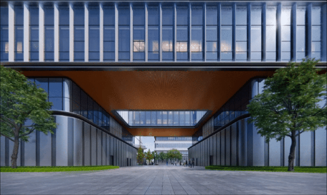 ▼仪式性的入口广场,展示企业形象,引入城市人流;链接人文的风雨连廊,作为大型会议空间为园区提供共享功能服务。