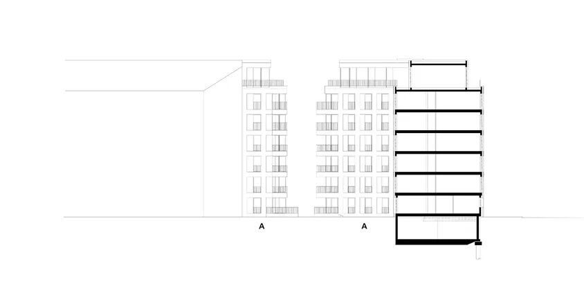 The basic layout of the ensemble of a total of 14 seamlessly connected buildings forms a P with a closed inner courtyard. Six full storeys each support a staggered storey. The diverse urban flair is reflected in the exterior of the complex. The predominantly glazed, commercially used ground floors integrate the row with an inviting front into the street space. While the structure of the upper floors is emphasised vertically throughout, each house stands out with its own design and individual details, such as its own surface material, its different finishes or the design of the balconies.
