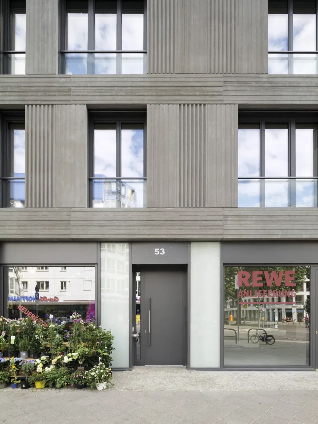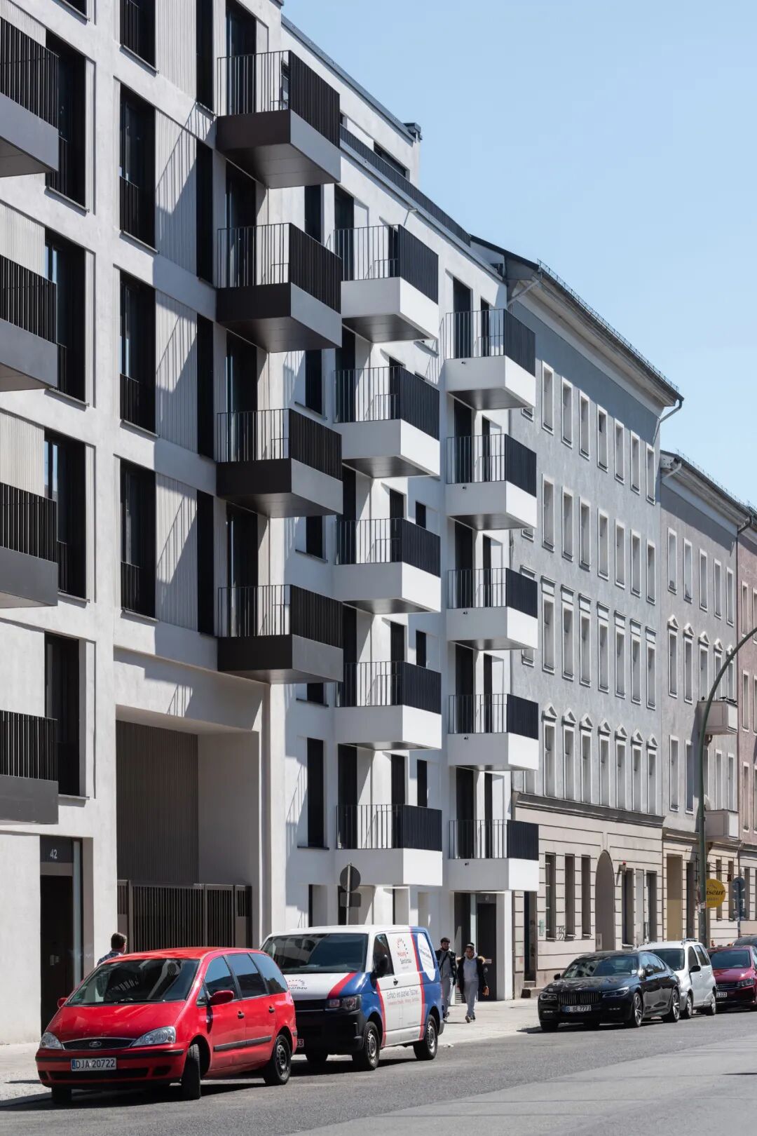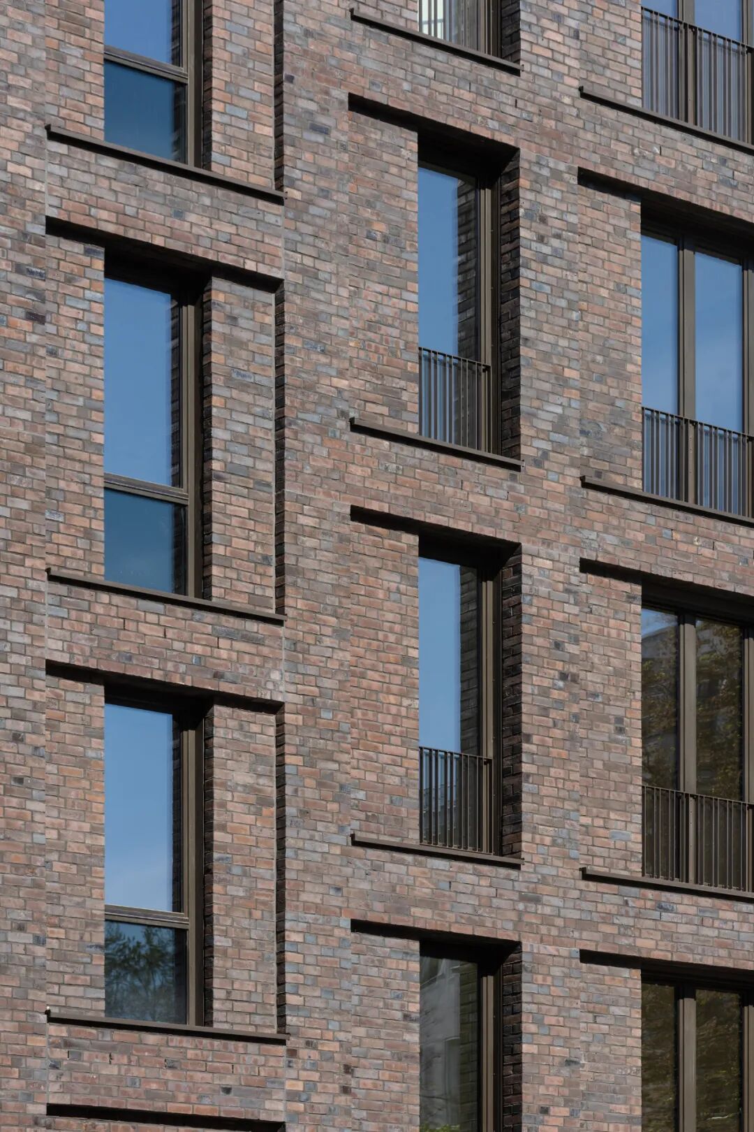立面的设计多样性与街景和谐地融为一体。多面立面的个别材料选择是对柏林建筑遗产的参考:砖、砖石的颜色和图案变化是指教堂和工业建筑,槽纹石膏是威廉时期的,裸露的混凝土和玻璃是当今的语言柏林. 内院的抹灰立面呈现出与街道立面相似的颜色和表面设计。